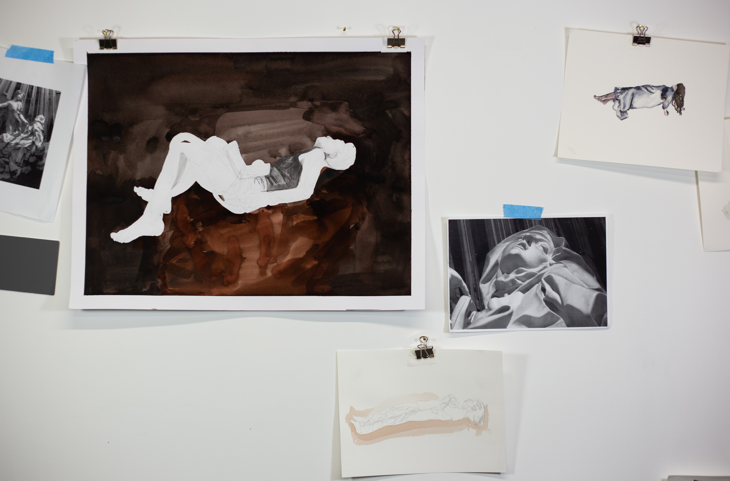 I spent the afternoon drawing bodies of Bernini sculptures from library books. Liquid forms of flesh rendered in stone then photographed, reproduced and here I turn them back into lines again. I leave the bodies adrift in coloured voids as if potentially falling through blue skies and green screens.